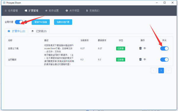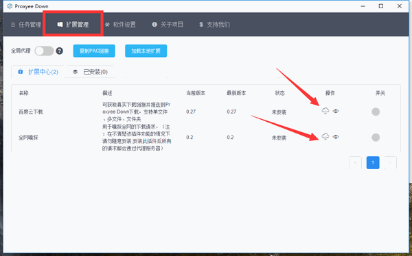 下载Proxyee-Down后,第一次启动,我们先在主界面上方找到【扩展管理】,然事先点击,点击后后我们会看到有两个扩展,然后我们下载并安装扩展,如上图