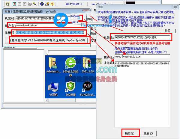 7、打开“注册机.exe”,将软件的机器码复制到注册机中,填写用户名www.downkuai.com,点击生成注册码,再将注册码复制到软件注册框中,点击确定