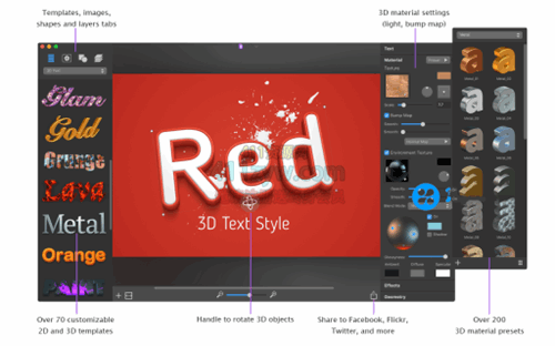 Art Text for mac是一个用于创建高质量文本图形、 标题、 徽标、 图标、 Web 站点元素和按钮的 Mac OS X 应用程序。由于多层支持创建复杂的图形。250 可编辑材料和 600 提供的矢量图标和形状会给你一个快速开始启动并运行。