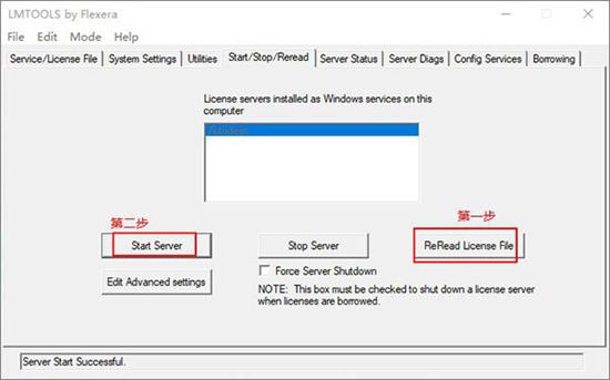 15、点击start/stop/read选项,点击 ‘rereadlicense file’,再点击’start server’启动服务。