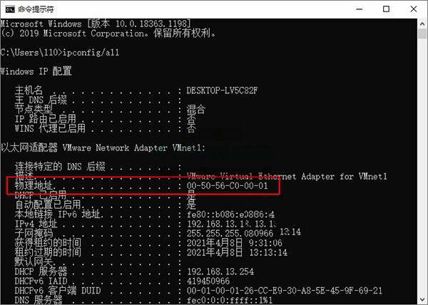 MAC地址:运行cmd,输入 ipconfig /all 获得物理地址【005056C00001】中间的“-”不需要;