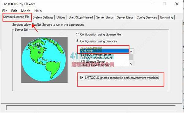 13、在“service/license file”中选择刚才的 Autodesk服务,然后勾选下面的ignore license file path env var;