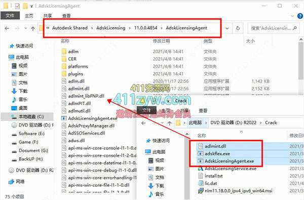 8、将crack补丁中的AdskLicensingAgent.exe、adlmint.dll文件复制到下列路径中,替换;