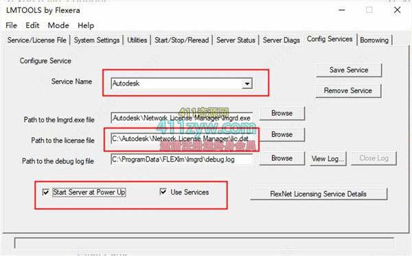 12、在config services中,添加“ Autodesk”服务名称,选择lmgrd.exe作为lmgrd的路径, lic.dat作为许可证文件的路径,然后勾选下面的start server at power up和use services;