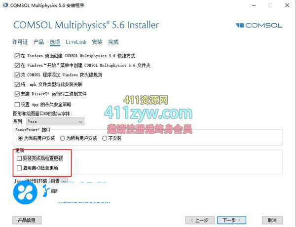 6、在选中,不用勾选安装完成后检查更新”和“启动自动检查更新”;