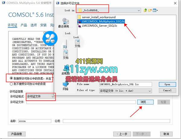 4、接受安装协议,许可证格式选择“许可证文件”,再选择软件包中_SolidSQUAD_文件夹下的“LMCOMSOL_Multiphysics_SSQ.lic”许可证文件;