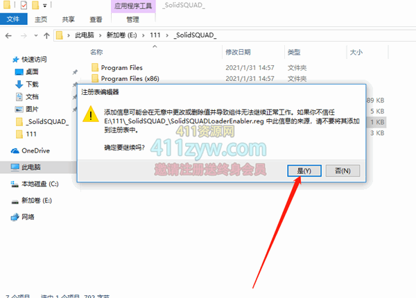 20 打开文件夹中的“_SolidSQUAD_”文件夹,然后选中“SolidSQUADLoaderEnabler”,双击,点击“是”,再点击“确定”!