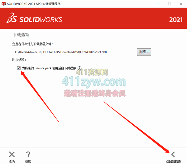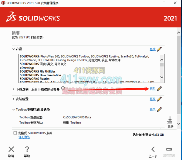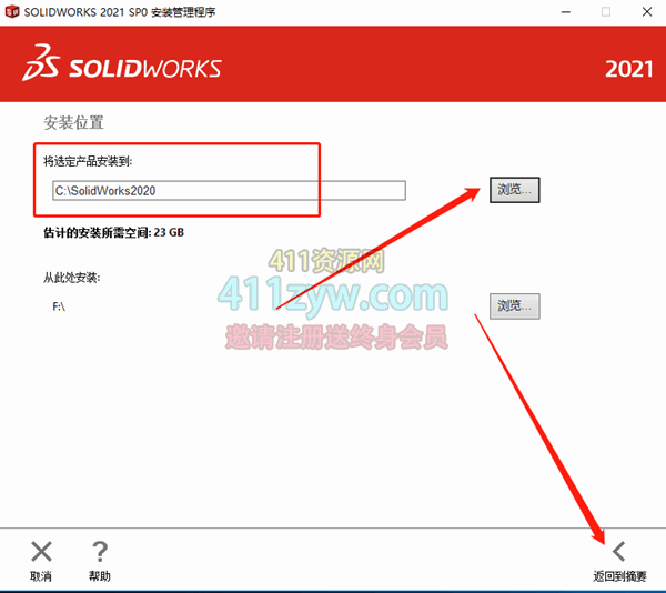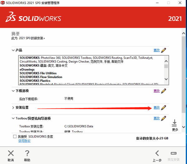 13 选择安装位置:点击“更改”,进去将(产品安装到一开始新建的SolidWorks2021文件夹),然后点击“返回到摘要”!