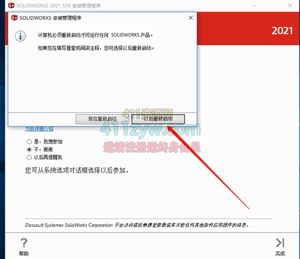 17 把上面勾去掉,下面点击“不,谢谢”,然后点击“完成”,再点击“以后重新启动”!