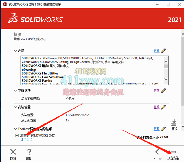 14 其他默认不用动,勾选“我接受SOLIDWORKS条款”,然后点击“现在安装”!