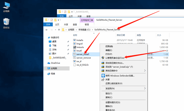 6 打开“SolidWorks_Flexnet_Server”文件夹,选中“server_install”右键“以管理员身份运行”,如果电脑上有其他版本,就先运行“server_remove”右键“以管理员身份运行”。然后按任意键结束!