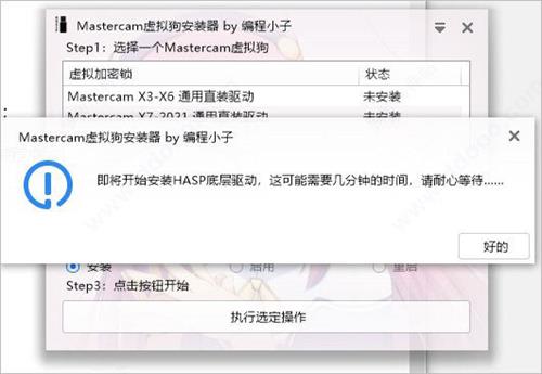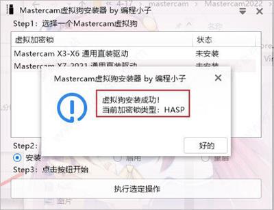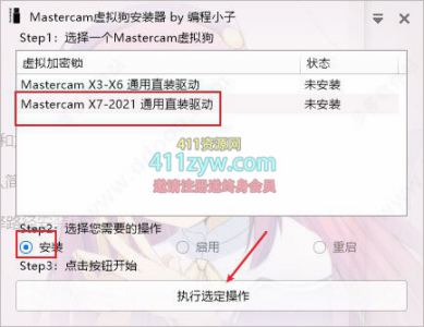 第二步:双击运行”Mastercam Virtural Key Installer.exe”程序,选择X7-2021直装驱动(2022可用),选择安装, 点击执行选定操作;
