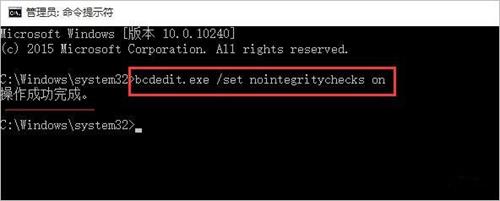 然后把bcdedit.exe /set nointegritychecks on复制到命令窗口,按回车执行即可。