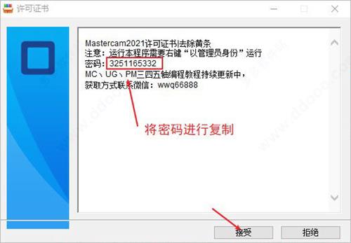 第三步:以管理员的身份运行”Mastercam去除黄条 右键以管理员身份运行.exe”程序,将密码复制下来,点击接受;