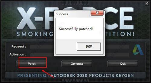 11、以管理员的身份运行破解文件夹中的”xf-adesk20_v2.exe”注册机,首先点击patch,弹出”successfully patched”,继而进行下一步;
