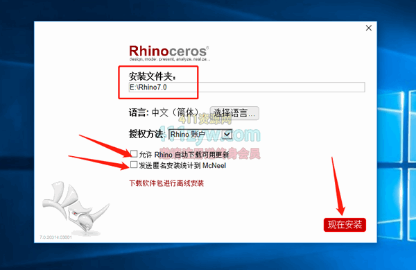 第五步 输入一开始新建好的Rhino7.0位置,下方两个勾去掉,然后点击“现在安装”!