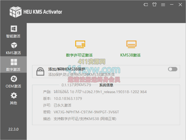 1、数字权利激活:仅支持Windows10(永久激活,与KMS机制无关)。