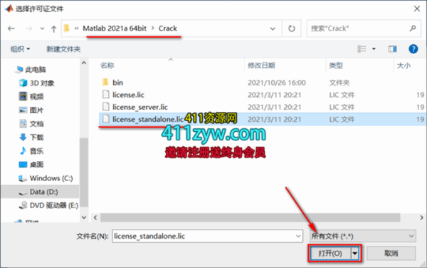8.在解压后的文件夹Matlab 2021a 64bit文件夹中的【Crack】文件夹,选中license_standalone.lic文件,点击“打开”