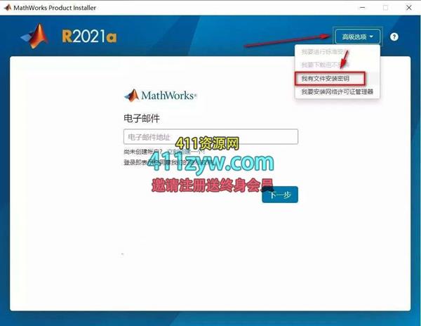 4.点击高级选项,选择“我有文件安装密钥”
