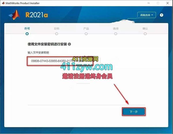 6.在输入文件安装密钥输入框中输入:09806-07443-53955-64350-21751-41297,点击“下一步”