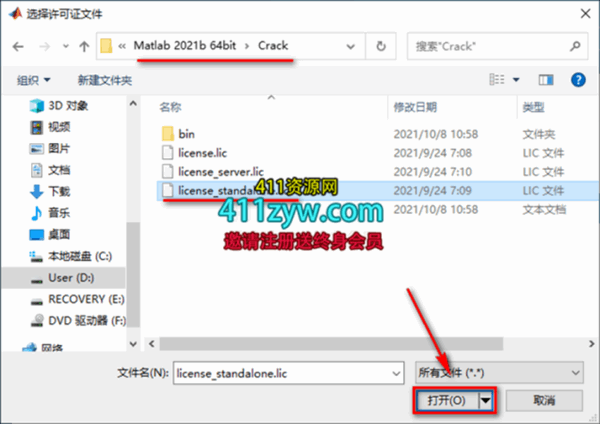 8.在解压后的文件夹Matlab 2021b 64bit文件夹中的【Crack】文件夹,选中license_standalone.lic文件,点击“打开”