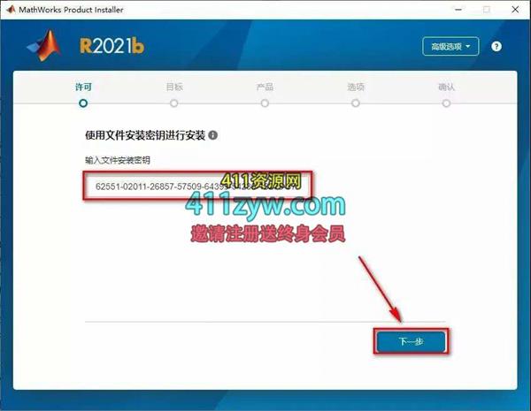 6.在输入文件安装密钥输入:62551-02011-26857-57509-64399-54230-13279-37181-62117-65158-40352-64197-45508-24369-45954-39446-39538-16936-10698-58393-44718-32560-10501-40058-34454,点击“下一步”
