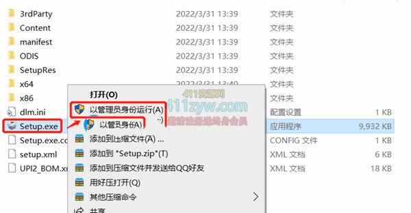 3. 选中Setup.exe,选择“以管理员身份运行 ”