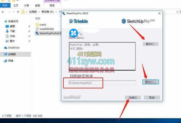 4. 如果没有中文,先选择上面的更改进去添加中文,点击下面的更改,选择一开始新建好的“SketchUp 2022”文件夹,然后点击“安装”!