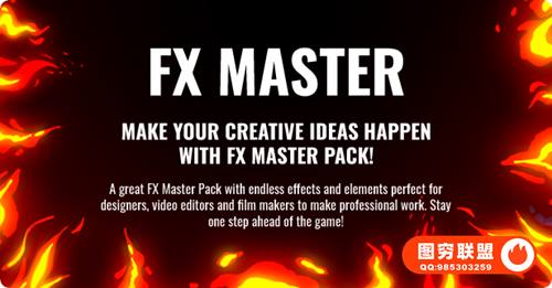 [AE/PR脚本插件]850种动漫卡通火焰烟雾能量电流爆炸转场液体霓虹魔法MG动画元素包 FX Master – Cartoon Action Elements