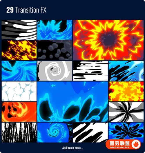 适用于2D,动作,动漫,卡通,爆炸,火,闪光,FX,徽标,霓虹灯,烟雾,火花,过渡,VFX,视觉效果等动画制作。