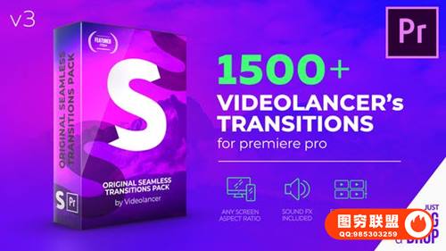 Seamless Transitions V3 拥有超过1500个过渡转场效果,包括10种不同的过渡类别:缩放过渡,平移过渡,小故障,3D框,形状,变形,漏光等等。1500个转场带音效,使用简单,将转场序列拖放到两段剪辑之上即得效果,转场序列带预览动画。支持任何分辨率 (自定义设置,默认1920 x1080);