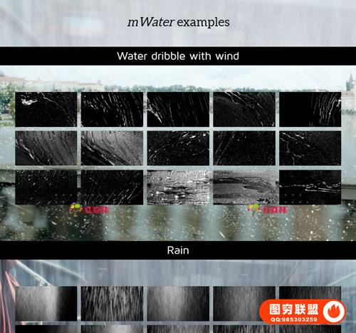 mWater包含了75组2K电影分辨率,专业,高质量,富有活力的下雨和水珠实拍视频效果素材,包括窗口玻璃上滚动滑落的下雨水珠,下雨效果,风吹下雨效果,仰拍下雨雨俯冲效果等多种类型和角度的视频素材。能结合场景模拟合成出真实的下雨和玻璃水珠视觉特效。可用于任何合成软件和非编软件中,支持任意的混合和复合模式。