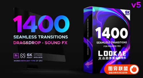 [PR模板]1400种平移缩放扭曲旋转图形炫光干扰损坏抖动无缝视频转场预设 Transitions V5