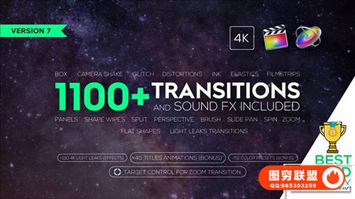 [FCPX插件]1100个冲击缩放旋转弹跳平移滑动扭曲变形抖动水墨转场特效文字标题动画+音效/4K炫光素材 Transitions and Sound FX + Bonus v7