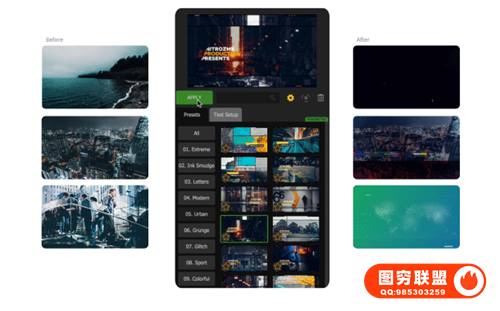 此脚本包含约1500种包装动画预设,分为16大类(现代时尚、图形遮罩、信号损坏、运动、企业商务、复古、水墨、文字遮罩、科技感等),每种预设都有多种参数可以调节,多种预设可叠加使用。