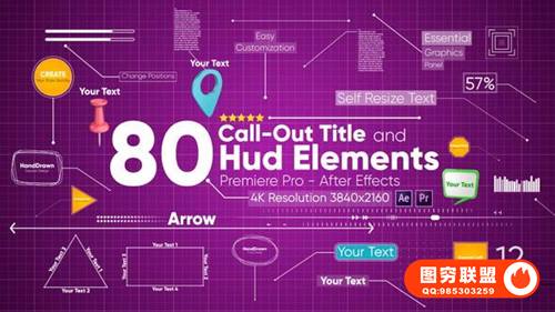 一共包含80组科技感线条指示线动画,修复支持中文版/英文版AE和PR,它们使用简单所有的文字颜色等都可以修改,不会出现任何表达式错误。15 个经典标注标题,33 个文本标注标题,3 个地图标记标注标题,9 个手绘呼出标题,5 个动态线路呼出标题,3 个自由线路呼出和12 个 Hud 元素。包括分步教程,不包括预览中的视频和图像。