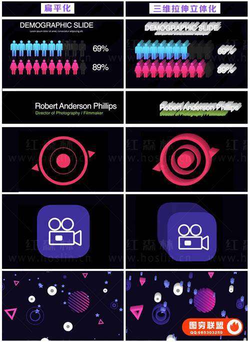 520个动画效果包括:100个图标动画;30个信息数据图表动画;100个字幕条动画;120个图形动画;120个文字标题动画;50个彩色背景动画。