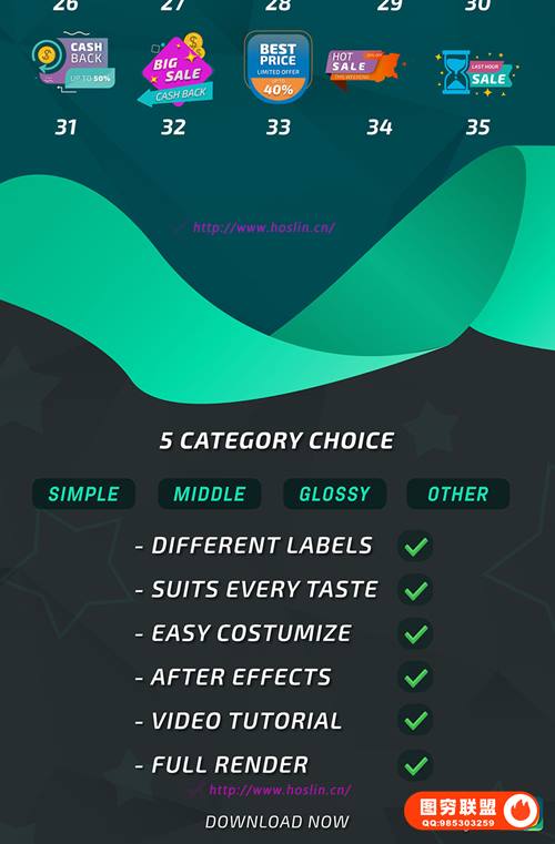 AE模板-35个商家店铺优惠降价打折促销标签贴纸图形动画 Sale Labels 项目特色: