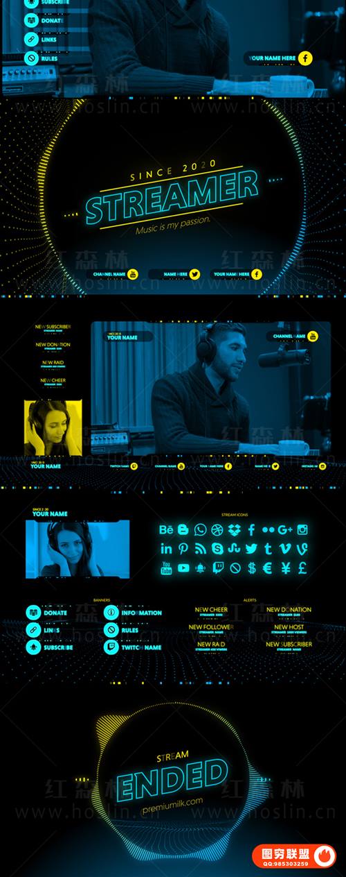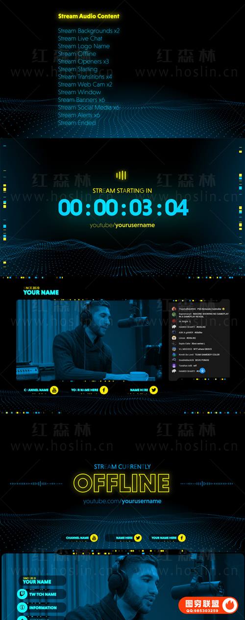 背景x2、实时聊天、徽标名称、离线串流、串流开瓶器x3、开始、转换x4、网络摄像头x2、窗口、横幅x6、社交媒体x6、警报x6、结束。