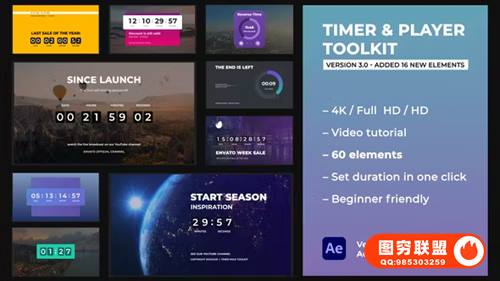 Timer & Player Toolkit 是通用的After Effects项目,用于为项目中的任何播放器设置倒数计时器,计数器,带有计时器的时间横幅块或倒计时。借助高级效果面板,您可以自定义任何类型的元素-调整大小,颜色,圆度等等。