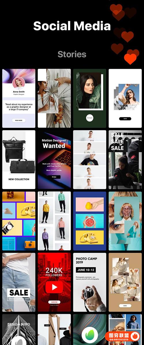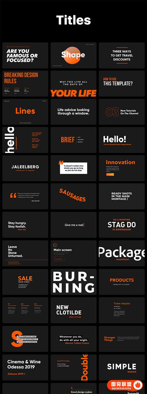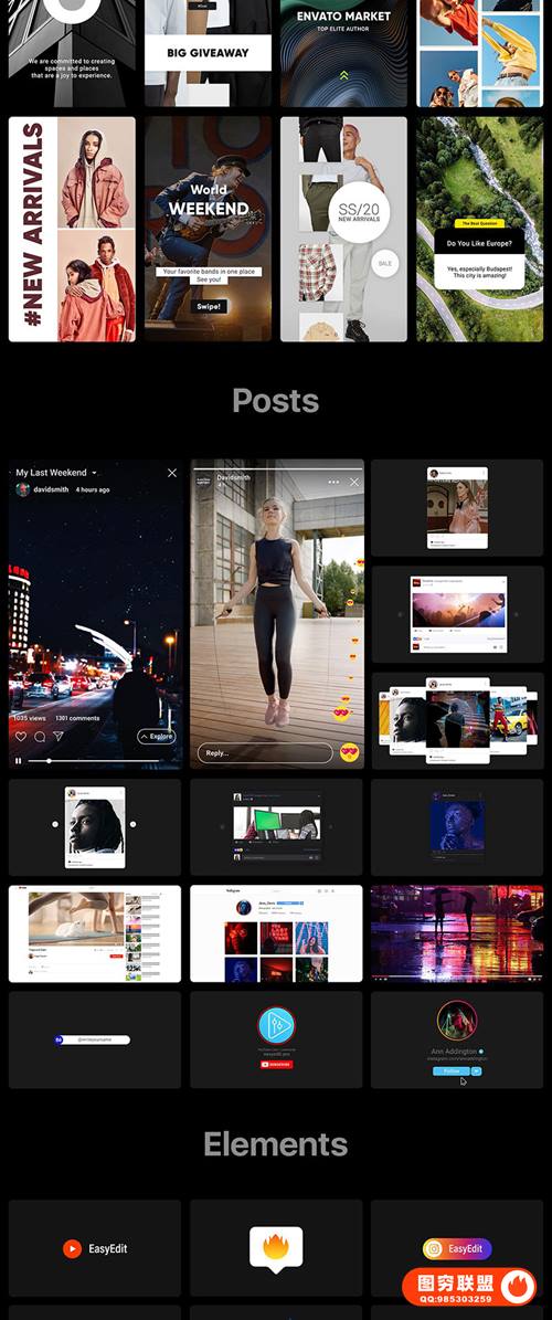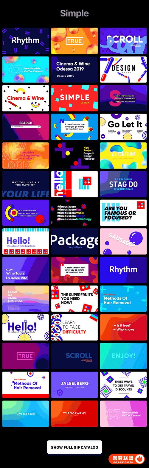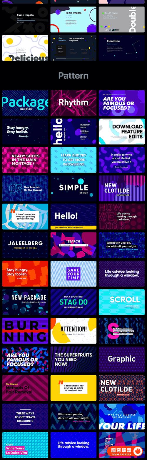 成为最佳内容创建者,这就是您所需要的!该包包含超过1250个现成的作品,可用于您的创意实现。非常适合网络社交媒体照片和视频! 结合排版与渐变和图案,添加不同的图形元素或使您的设计。准备使用模板,让视频爆炸。 因此,别忘了再做一件事!使用EasyEdit脚本直接预览动画,找到喜欢的效果导入项目中,只需几秒钟即可制作完美动画。