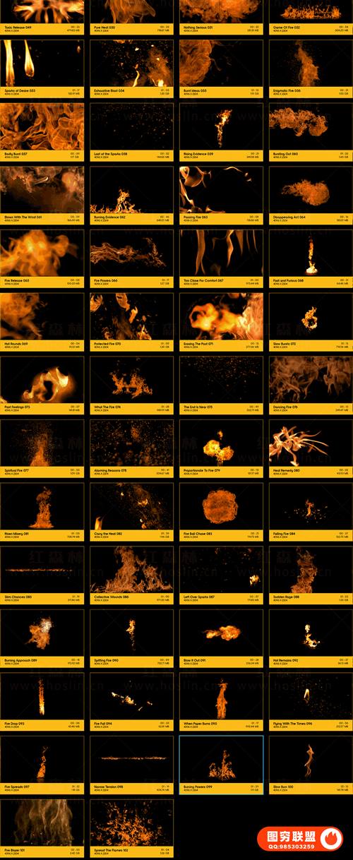 提供102个真实火焰燃烧动画4K视频素材,可用于VFX特效合成、转场、背景中使用。分辨率:4096*2304,4K高清;无透明通道(可修改混合模式去黑底透明叠加使用)。