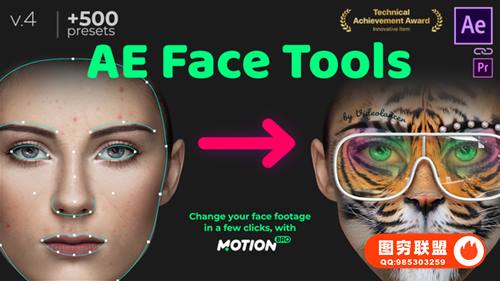 这是一款强大AE扩展脚本工具AE Face Tools 人脸追踪工具,它包含超过500种预设,如换脸,换妆,美颜,液化,失真扭曲,面部修饰,蒙板工具,文字跟踪,变换,添加元素,人脸锁定防抖稳定术(抖音很火的效果),遮挡等预设效果工具;大大扩展After Effects中标准人脸跟踪的功能。