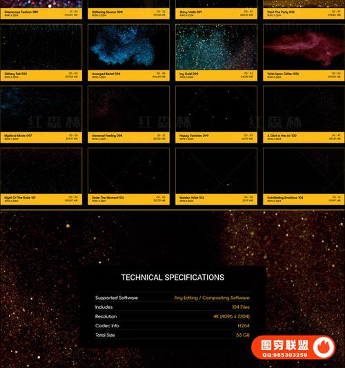 提供104个华丽闪耀发光金粉粒子闪烁动画4K视频素材。在Phantom Flex上以高达1000 FPS的速度拍摄,只需拖到您的视频上,无需任何插件,完美用作特殊效果或背景。分辨率:4096*2304,4K高清;无透明通道(可修改混合模式去黑底透明叠加使用)。