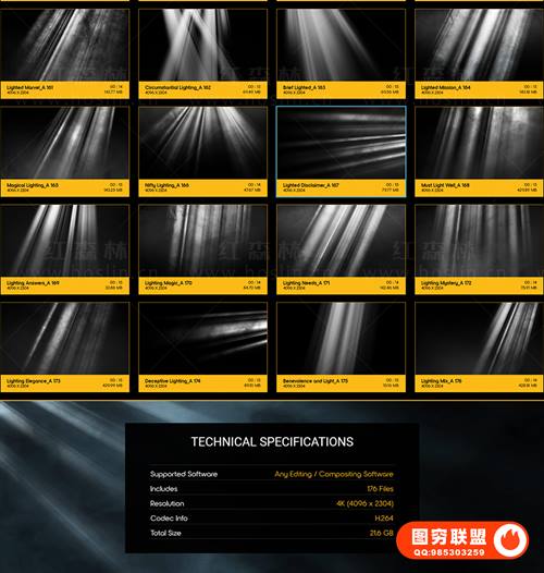 提供176个体积光聚光灯光线照射丁达尔光线耶稣光合成动画 4K视频素材。在Phantom Flex上以高达1000 FPS的速度拍摄,只需拖到您的视频上,无需任何插件,完美用作特殊效果或背景。分辨率:4096*2304,4K高清;无透明通道(可修改混合模式去黑底透明叠加使用)。