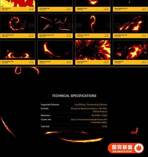 提供152个二维卡通火焰燃烧MG动画4K视频素材(每个素材还提供Anim和Prores两种编码)有Alpha透明通道;每个动画还提供了单独AE模板工程。适用于VFX特效合成、画面叠加或背景中使用。分辨率:4096*2304,4K高清;有透明通道。
