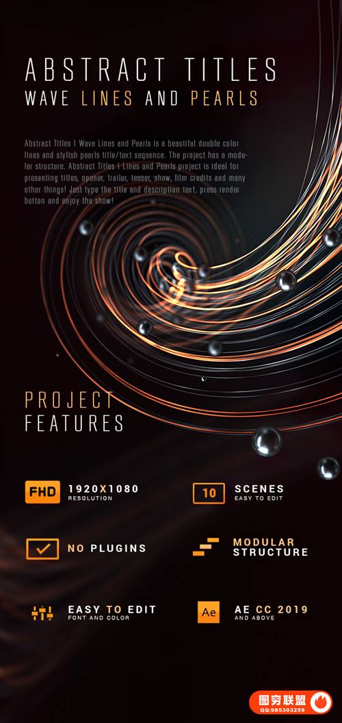 Abstract Titles Wave Lines and Pearls是一个漂亮的双色线条和时尚的珍珠标题/文字序列。该项目采用模块化结构。摘要标题 | Lines and Pearls 项目非常适合展示标题、开场白、预告片、预告片、节目、电影字幕和许多其他内容!只需输入标题和描述文本,按渲染按钮即可享受节目!模板共有10个场景(每个场景持续7秒),可自定义字体:更改字体、字体大小、颜色等。