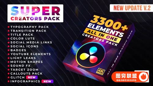 [达芬奇模板]3300个视频LUTS调色文字标题图形动画无缝转场预设包 Super Creators Pack v1.3