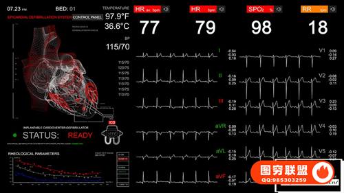 Screen 02/cardiac monitor包含5种不同的ECG曲线:正常、心动过缓、心搏停止/死亡、心室颤动、室性心动过速,每一种都可以在项目中轻松选择。