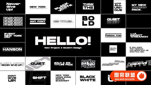 拥有30个超大黑白文字标题动画,可以修改任意文字,支持输入中文,设置持续时间,修改颜色大小位置等属性。渲染快速,包含视频教程。